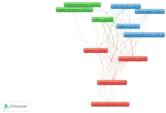 Regarding the bibliographic coupling (Figure 5), 14 reports, distributed into three clusters have shared references. Likewise, the co-cited network, themes, and reports from each bibliographic coupling cluster were settled (Table 2). The following themes were addressed: characterization and health benefits of chia seed proteins/peptides (cluster 1), health benefits and functional properties of chia seeds and derivatives (cluster 2), and characterization and chemical composition of chia seeds and derivatives (cluster 3). The most cited reports belong to cluster 3, with 238 citations [26]. This report is important because it addresses the chemical composition of chia seeds [26].