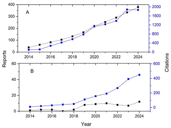 A number of reports and citations of “Salvia hispanica” and “protein” (A) and “Salvia hispanica” and “peptide” (B) from 2014 to 2024 retrieved from Scopus database.