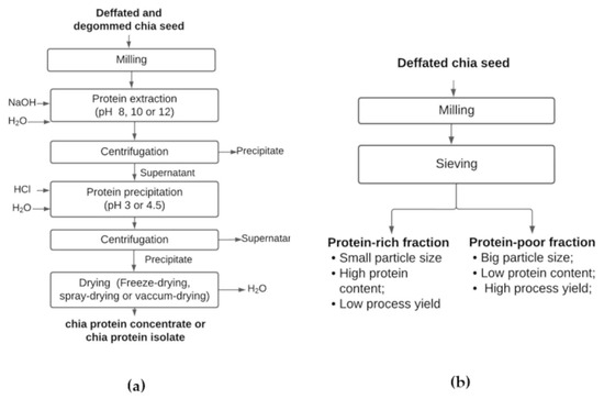 Flowchart of chia protein concentrate or chia protein isolate production by alkaline extraction followed by isoelectric precipitation (a) and flowchart of protein-rich fraction production by dry fractionation process (b).