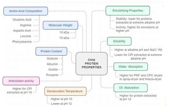The use of chia protein derivatives as emulsifying/co-emulsifying agents represents a potential application in the food industry, and the appropriate process conditions must consider amino acid profile, solubility, surface hydrophobicity, denaturation, emulsifying properties. Extraction of chia protein isolates and chia protein concentrates under higher pH increased surface hydrophobicity and reduced solubility, which may impair chia protein’s ability to stabilize emulsions. In turn, for chia peptides, a greater hydrolysis degree may improve its emulsifying activity but may decrease its biological activity.
