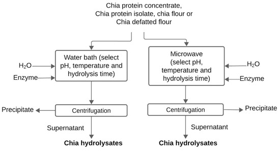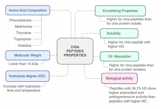 Extraction and hydrolysis conditions play a significant role in determining the characteristics of chia proteins and peptides. Factors such as pH and temperature during extraction impact the composition of amino acids and the protein’s structural configuration. These changes subsequently affect the protein’s techno-functional attributes and potential application in food products [6,7]. Chia proteins are obtained after milling the seeds and removing the mucilage and the oil, obtaining degummed flour and defatted flour, respectively [1]. Chia peptides are obtained mainly from the hydrolysis of chia proteins [8,9].