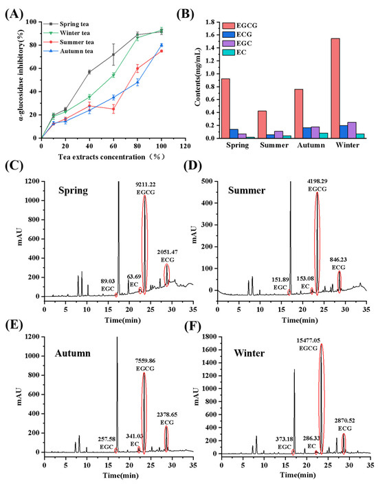 Effect of tea harvesting season on α-glucosidase inhibition (A); Contents of the catechin monomers in Dancong four season tea (B); HPLC analysis chromatogram of the catechin monomers in spring tea (C), summer tea (D), autumn tea (E), and winter tea (F).