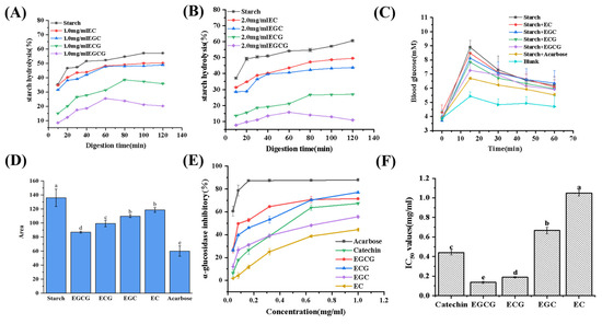 Effect of the catechin monomers on in vitro digestion of starch (A,B); in vivo postprandial blood glucose content (C) and α-glucosidase inhibition (E); the calculated area under the curve of glucose content (D) and IC50 values (F). Different letters (a–e) in Figure 2D,F indicate significant differences (p < 0.05).