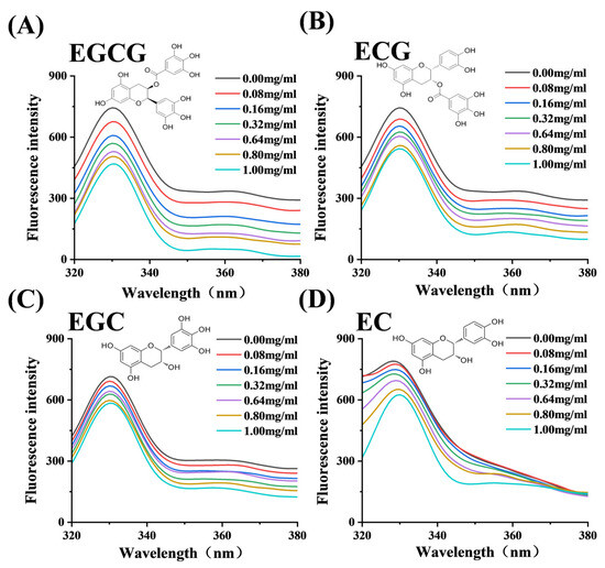 The effect of EGCG (A), ECG (B), EGC (C), EC (D) on the synchronous fluorescence spectra of α-glucosidase at Δλ = 15 nm.
