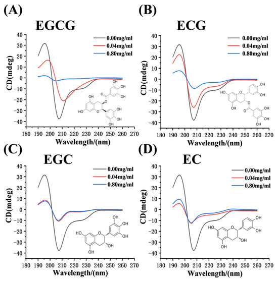 The CD spectra of α-glucosidase (0.4 U/mL) and EGCG/ECG/EGC/EC (0.00, 0.04, and 0.80 mg/mL) were acquired from 190 to 260 nm on a Chirascan spectrometer (MOS 450, Bio-logic Corp., France) at 298 K. The entire analysis was conducted under a nitrogen-purged atmosphere to ensure consistent conditions. A quartz cuvette with a path length of 0.05 mm was utilized for precise optical measurements. Then the data were calculated by CDPro-SELCON3 software to analyze the changes of protein secondary structure (α-helices, β-sheet, β-turn, and random coiling).