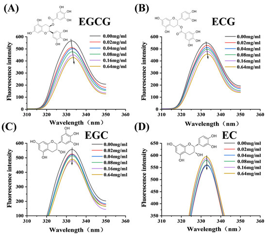 The α-glucosidase solution (0.5 U/mL) of 50 μL was titrated by continuous addition with 50 μL different concentrations of EGCG/ECG/EGC/EC (0.00, 0.08, 0.16, 0.32, 0.64, 0.80, and 1.00 mg/mL) at 304 K or 310 K. After equilibration for 5 min, the fluorescence spectra at 300–400 nm were measured using an RF6000 spectrofluorometer (Shimadzu, Kawasaki, Japan) at an excitation wavelength of 280 nm; the excitation and emission bandwidths were 10 nm. To decipher the underlying mechanism of fluorescence quenching, the Stern–Volmer equation was employed as a tool for comprehensive analysis [11]. The fluorescence data employed in this study underwent correction via an established formula, aiming to mitigate and eliminate potential inner filter effects that could confound the analysis [12].