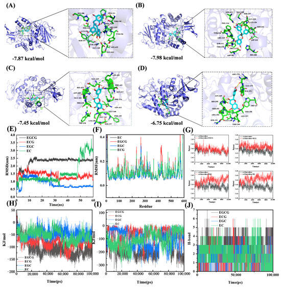 The optimal 3D docking conformation of EGCG (A), ECG (B), EGC (C), EC (D) with α-glucosidase. The molecular dynamic results of RMSD (E), RMSF (F), Rg (G), Lennard–Jones potential (H), Coulomb interaction energy (I), hydrogen bond profile (J) of α-glucosidase–EGCG/ECG/EGC/EC complex.
