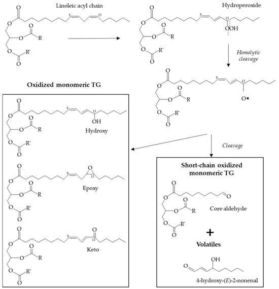 Possible chemical structures that can be generated during frying in the oxidation of linoleic chain (C18:2ω6) supported in position sn-1 of triglyceride (TG). R and R’ substituents can be different FA. Adapted from [90].