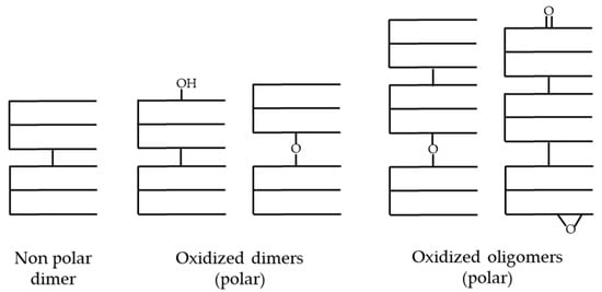 As the temperature rises, the solubility of oxygen decreases, accelerating thermodegradation reactions and promoting the formation of polymeric compounds through interactions between alkyl (R*) and alkoxyl (RO*) radicals in unsaturated acyl groups supported on TG, as can be observed in Figure 2 [3,97,98]. Consequently, TG dimers and oligomers of very different structures are formed, which constitute one of the main and most complex groups of degradation products in frying oils. They can be polar or non-polar, depending on the presence or absence, respectively, of one or more oxygenated functional groups either in the FA chain (e.g., hydroxy, keto, epoxy) or in the linkage between TG (ether or carbon–carbon bond). It must be noted that the presence of non-polar oligomers has not been reported in used frying oils [59]. Figure 4 shows some possible schematic structures of these high-molecular-weight polymeric compounds [59,99].
