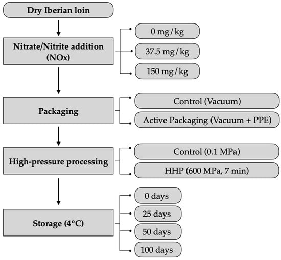 Three batches of Iberian dry-cured loins (n = 5) were prepared with different ongoing amounts of potassium nitrate/sodium nitrite (NOx): (a) 150 mg/kg NaNO2 + 150 mg/Kg KNO3, (b) 37.5 mg/kg NaNO2 + 37.5 mg/Kg KNO3, and (c) 0 mg/kg NaNO2 + 0 mg/Kg KNO3, as described previously [].