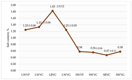 After performing a comparative analysis, statistically significant differences were found in the general acceptability of the smell. The smell of samples LWYC (6.49) and LWYG (7.30) was significantly different from that of LWYP (6.03) and LBYC (4.34) (p < 0.05) (Table 8). The overall taste acceptability of the LWYG sample (6.34) was significantly different from those of samples LWYP (2.87), LBYC (4.50), and LWYC (4.76). The overall product acceptability of the LWYG sample (5.99) was significantly different from those of samples LWYP (3.09), LBYC (3.84), and LWYC (4.64).