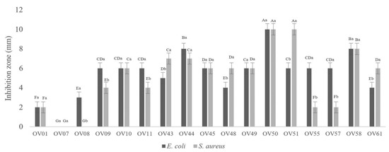 Antibacterial activity of native supernatant of isolates against E. coli ATCC 8739 and S. aureus ATCC 6538. A–G: significant difference (p < 0.05) between activities of isolates, a,b: significant difference for each isolate against the two pathogens.