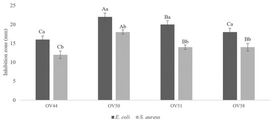 Seventeen Gram-positive bacilli deprived of catalase activity were isolated from seven different samples of olives in brine, as shown in Figure 1. All CFS were active against E. coli ATCC 8739 and S. aureus ATCC 6538, especially those prepared from strains 44, 50, 51, and 58. The antibacterial activity increased with the concentration of the CFS, as shown in Figure 2. It is noteworthy that none of the supernatants showed antibacterial activity after pH neutralization of the CFS. After testing the antibacterial activity against S. aureus ATCC 6538 and E. coli ATCC 8739, OV50 was selected as the best candidate for further characterization and application.