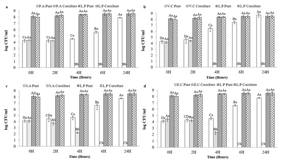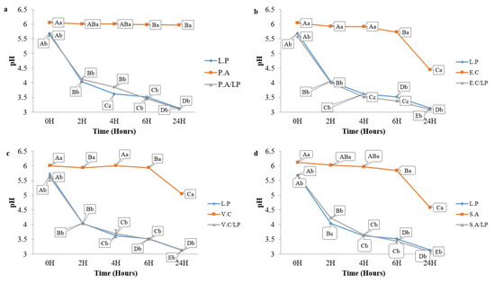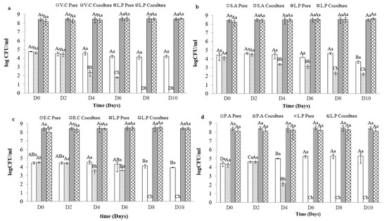 Effect of L. plantarum OV50 (L.P) in coculture with: (a) P. aeruginosa ATCC 27835 (P.A), (b) V. cholerae ATCC 14035 (V.A), (c) S. aureus ATCC 6538 (S.A), and (d) E. coli ATCC 8739 (E.C) at 37 °C. A–D: significant difference (p < 0.05) during time, a,b: significant difference between the inoculated and the control group of sardines.
