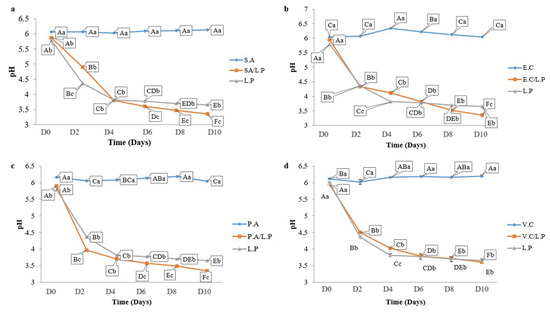 pH evolution during coculture: (a) S. aureus ATCC 6538/L. plantarum OV50 (S.A/L.P), (b) E. coli ATCC 8739/L. plantarum OV50 (E.C/L.P), (c) P. aeruginosa ATCC 27835/L. plantarum OV50 (P.A/L.P), and (d) V. cholerae ATCC 14035/L. plantarum OV50 (V.C/L.P) at 7 °C. A–F: significant difference (p < 0.05) over time, a–c: significant difference between inoculated and control group of sardines.