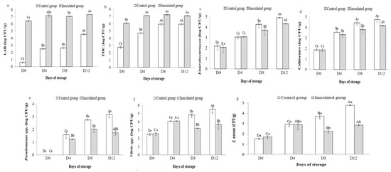 Enumeration of (a) lactic acid bacteria (LAB), (b) total mesophilic count (TMC), (c) Enterobacterales, (d) Coliforms, (e) Pseudomonas spp., (f) Vibrio spp., and (g) S. aureus in control and inoculated sardines. A–D: significant difference (p < 0.05) over time, a,b: significant difference between the inoculated and the control group of sardines.