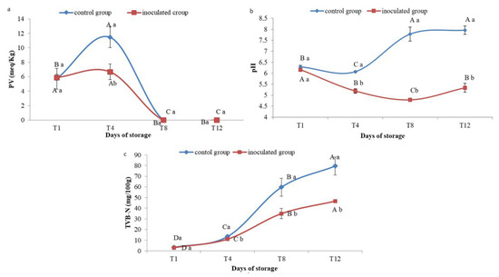 Changes in (a) peroxide value, (b) pH, and (c) total volatile basic nitrogen (TVB-N) of inoculated and control groups of sardines during storage. A–D: significant difference (p < 0.05) over time, a,b: significant difference between inoculated and control group of sardines.