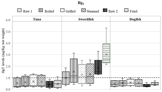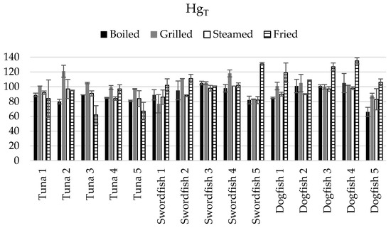 In terms of the average HgT loss or gain outcome after cooking, it varied between–19% (fried tuna) to 19% (fried dogfish). A significant decrease in average HgT levels after cooking was also observed in boiled tuna (−15%). On the other hand, as well as in the case of fried dogfish, no decrease in HgT was observed in grilled tuna and fried swordfish.