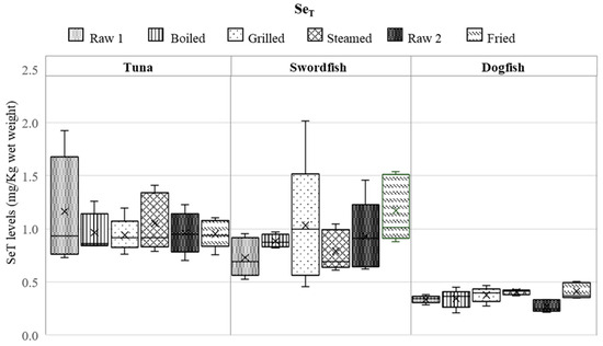 The levels of SeT in swordfish were significantly higher in the fried samples (p < 0.05), compared to the raw ones. In dogfish, it was found that the SeT concentrations of grilled, steamed, and fried samples are significantly higher than the respectively raw samples. However, in tuna samples there were no significant differences in SeT levels before and after cooking (p ≥ 0.05). From the 12 cases examined, 8 cases did not show any substantial variations. Thus, only four cases showed significant increases of SeT, namely, one fried swordfish sample and three dogfish cooked samples (grilled, steamed, and fried).