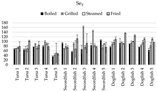 Figure 4 presents the cooking balance related to SeT levels in cooked samples of tuna, swordfish, and dogfish by boiling, grilling, steaming, and frying.