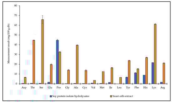 The total protein content of SPIH and YCE showed both extracts containing protein quantities of 58.31 g/100 g and 79.57 g/100 g, respectively. Additionally, both extracts were investigated concerning 17 amino acids using the HPLC technique. SPIH was found to comprise five predominant amino acids, including Pro, Lys, Phe, His, and Tyr at concentrations of 44.62, 21.74, 11.27, 8.89, and 6.70 mg/100 g, respectively. The remaining amino acids were detected within a range of 0.15–1.71 mg/100 g. Notably, Leu was not detected in the extract. Focusing on the YCE, it contained all types of amino acids with the highest content of Ser (65.77 mg/100 g) and Lys (61.12 mg/100 g). Other amino acids included Thr, Ala, Pro, His, Tyr, Arg, Glu, Ile, Phe, Gly, Cys, Met, Asp, Leu, and Val, which were found in the extract with average values of 44.57, 39.63, 32.65, 26.97, 23.75, 21.28, 19.79, 16.43, 15.33, 14.12, 13.67, 12.46, 6.60, 6.54, and 3.53 mg/100 g, respectively (Figure 1). According to Djemal et al. [37], Arg, Leu, Lys, Glu, and Asp were the types of amino acids that were abundant in soy hydrolysates, with the molecular weight distribution of peptides being below 0.5 kDa. Commercial soy protein hydrolysates were composed of peptides/amino acids, carbohydrates, vitamins, lipids, and minerals. The protein content exhibited variability within a range of 56–58%, influenced by batch-to-batch differences and soybean cultivation [43,44]. Yeast extract primarily contained umami-flavor amino acids such as Glu, Ala, Gly, and Asp, along with various other types of amino acids like Ser, Val, and Pro depending on the variety of yeasts. The free amino acid content in yeast extract comprised approximately 35–40% of the total protein, with 40–45% of yeast oligopeptides having a molecular weight ranging from 2 to 3 kDa [16,22,45,46]. Based on the chemical composition of both SPIH and YCE, the sugar–protein conjugates formed through the Maillard reaction may interact synergistically, with the reaction rate being limited by the quantity of the sugar.