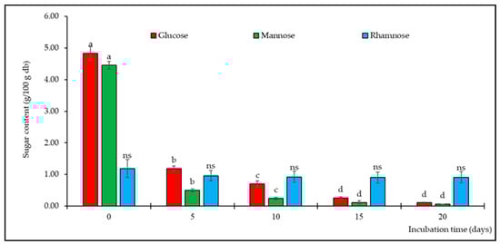 Amount of glucose, mannose, and rhamnose in the SPIH-YCE samples during the humid–dry heating procedure at different incubation times. Different lowercase letters indicate significant differences among the different incubation times in amount of glucose, mannose, and rhamnose (p ≤ 0.05); ns indicates not significant (p > 0.05).