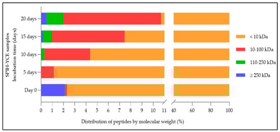 All SPIH-YCE samples were evaluated for the distribution of peptide molecular weight using HPLC, as seen in Figure 3. Molecular weight peptides were separated into four size categories (>250 kDa, 101–250 kDa, 10–100 kDa, and <10 kDa). The SPIH-YCE sample without incubation contained approximately 97.68% of peptides with a size of <10 kDa, followed by 2.12% of peptides >250 kDa, and 0.20% of peptides in the 10–100 kDa size range. Peptide chains larger than 250 kDa decreased after the 5th day of incubation, and these larger peptides were distributed slightly more in the SPIH-YCE conjugates after 10 days of incubation, with a size distribution ranging from 0.02% to 0.48%. Conversely, their distribution increased after 5 days of incubation when focusing on peptides with a size of less than 10 kDa, but decreased as the remaining incubation duration continued, with the molecular weight distribution declining from 98.85% to 89.30%. In addition, only peptides with a molecular weight between 10 and 100 kDa increased in percentage distribution from 0.20% to 8.73% after 5 days of processing. Peptides ranging from 100 to 250 kDa occurred in the SPIH-YCE conjugates on day 10 of the process, and they exhibited a slight increase during the incubation period.