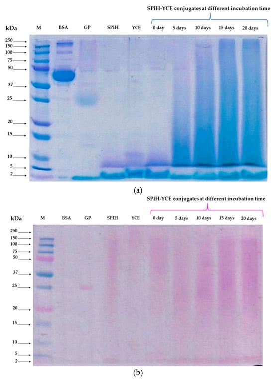 SDS-PAGE gel image of SPIH-YCE samples during the humid–dry heating procedure at different incubation times; (a) Coomassie brilliant blue; (b) glycoprotein stain. Lane M: protein marker; lane BSA: bovine serum albumin; lane: GP: glycoprotein (horseradish peroxidase); SPIH: soy protein hydrolysates; YCE: yeast cell extract; 0 days–20 days: SPIH-YCE conjugates at different incubation times.
