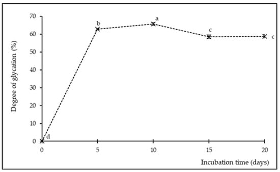 Degree of glycation of SPIH-YCE samples during the humid–dry heating procedure at different incubation times. Different lowercase letters indicate significant differences among the different incubation times in degree of glycation (p ≤ 0.05).