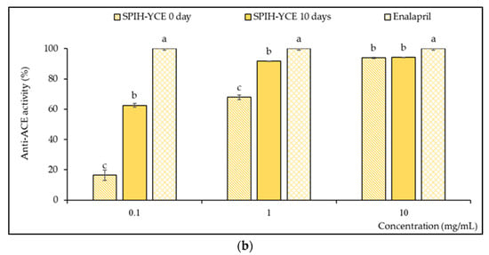 ACE inhibition was also analyzed for these two samples (Figure 6b). ACE is an enzyme that catalyzes the conversion of angiotensin I to generate angiotensin II, which exhibits strong vasoconstrictor activity. It also cleaves the vasodilator bradykinin, contributing to an increase in blood pressure. Thus, ACE inhibition was used as a preliminary step before in vivo confirmation to assess its potential to prevent hypertension [41]. The results showed that an increase in the concentration of the samples from 0.1 to 1.0 mg/mL led to a significant increase in anti-ACE activity (p ≤ 0.05). After 10 days of incubation, the conjugated SPIH-YCE exhibited a higher inhibition rate than the unincubated SPIH-YCE sample. The percentage of ACE inhibition for SPIH-YCE conjugates ranged from 62.54% to 94.16%, while the control sample showed inhibition in a range from 16.39% to 93.93%. The IC50 values for SPIH-YCE (without incubation) and SPIH-YCE conjugates were 0.68 mg/mL and <0.10 mg/mL, respectively. Enalapril was used as a positive control with an IC50 value of 0.03 µg/mL. In addition, there was no significant difference in the ACE inhibition rate when using samples at a concentration of 10 mg/mL.