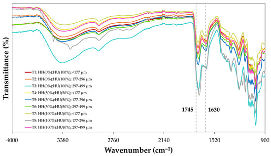FT-IR spectra of pectin from red dragon fruit peel powder (RDF-PP) at different red dragon fruit peels ratio (RDF-PR; HH(0%):HU(100%), HH(50%):HU(50%), and HH(100%):HU(0%)) and particle size (PS; <177 µm, 177–296 µm, and 297–499 µm) based on nine treatments of the 3k full factorial design (Table S2).