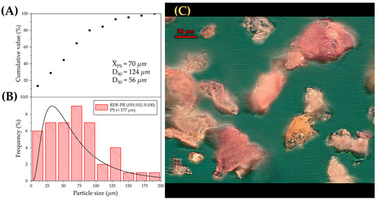 The particle size distribution of RDF-PP from T1 (RDF-PR, HU at 100%; PS < 177 µm) is shown in Figure 5. The fine fraction showed an average PS (XPS) of 70 µm with an equivalent diameter at a cumulative frequency of 50% (D50) of 56 µm and an equivalent diameter at a cumulative frequency of 90% (D90) of 124 µm. Figure 5C shows that the fine fraction exhibited reddish particles from the exocarp fraction of RDFP. Nevertheless, white and translucent particles were also observed, which probably indicates the occurrence of particles from the mesocarp fraction.