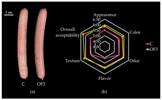 Sensory analysis of emulsified alpaca-based sausages: (a) morphological features of sausages with two different fat replacement levels of 0.00% (C, control formulation) and 9.86% (OF3, optimal formulation 3) hydrated red dragon fruit peel powder; and (b) sensory properties (appearance, colour, odour, flavour, texture, and overall acceptability) of C and OF3 sausages.