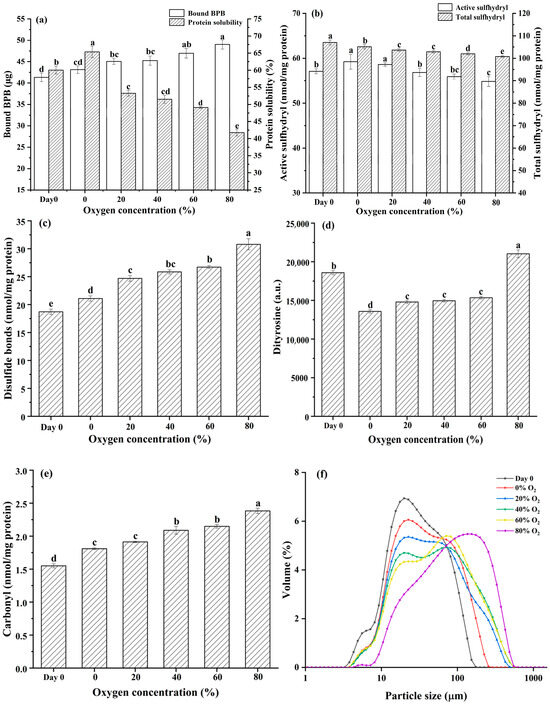 Surface hydrophobicity and protein solubility (a), active sulfhydryl and total sulfhydryl groups (b), disulfide bonds (c), dityrosine contents (d), carbonyl contents (e), and particle size distribution (f) of paste protein from pork before storage (Day 0) and after being placed in refrigerated storage for 5 days in a modified atmosphere with different O2 concentrations. Note: the bar indicates standard error of means. Different lowercase letters indicate significant differences among treatment groups (p < 0.05).