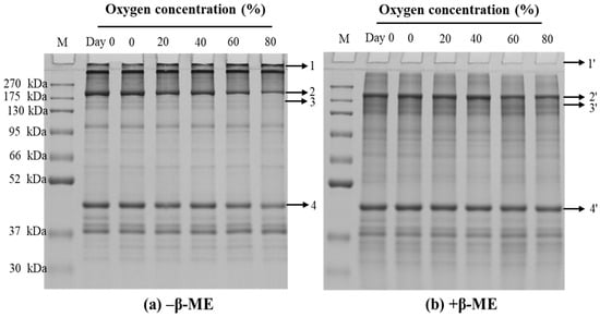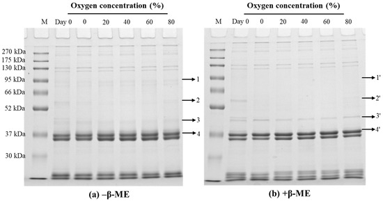 Representative SDS–PAGE patterns of paste protein in non-reduced form ((a) −β-ME) and reduced form ((b) +β-ME) from pork before storage (Day 0) and after being placed refrigerated storage for 5 days in a modified atmosphere with different O2 concentrations.