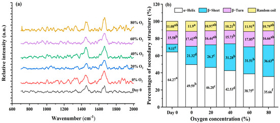 Raman spectra (a) and secondary structures (b) of pork paste gels from minced meat before storage (Day 0) and after being placed in refrigerated storage for 5 days in a modified atmosphere with different O2 concentrations. Note: different lowercase letters indicate significant differences among treatment groups (p < 0.05).
