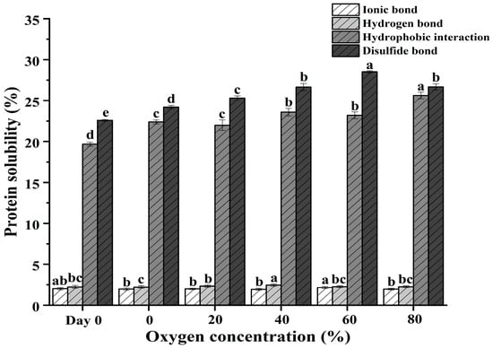 Chemical forces of pork paste gels from meat before storage (Day 0) and after being placed in refrigerated storage for 5 days in a modified atmosphere with different O2 concentrations. Note: the bar indicates standard error of means. Different lowercase letters indicate significant differences among treatment groups (p < 0.05).