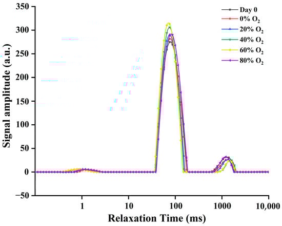 As shown in Figure 5, the NMR curves for all gels exhibited three distinct peaks, T21 (0–5 ms), T22 (30–200 ms), and T23 (700–2000 ms), which signified tightly bound water, immobilized water, and free water, respectively [61]. In particular, a shorter relaxation time (T2) implies reduced water mobility and intensified interaction between water molecules and proteins within the gel structure [62]. As presented in Table 2, with the O2 concentration from 0% to 60%, T21 and T22 of gel decreased, from 1.18 ms to 0.79 ms, from 79.25 ms to 73.07 ms, respectively. Nevertheless, when O2 concentration reached 80%, an increase in T21 and T22 was observed, suggesting the water fluidity was raised and flowed out more easily during processing. Moreover, the proportions of peak areas corresponding to the three states of water were shown as P21, P22, and P23. The immobilized water (P22) occupied the major constituent in the gel (91–95%), which was followed by free water and bound water. The P22 significantly increased from 92.50% to 94.82%, with an increase in O2 concentration (0–60%). Concurrently, P23 experienced a notable drop from 6.10% to 3.44%. This observation suggests that protein oxidation not only hinders water fluidity in the gel but also promotes the transformation of free water into immobile water, indicating increased water entrapment within the protein structure, leading to immobilization. These were also in accordance with the detection of water holding capacity. According to chemical forces in the gel, changes in inter- and intramolecular bonds within proteins, induced by oxidation, influenced proton accessibility, thereby causing alterations in the relaxation velocity of water in close proximity to protein molecules and its retention ability.