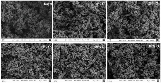 Microstructural analysis was conducted to elucidate variations in the network structure of the gel subjected to MAP treatment at different O2 concentrations. As presented in Figure 6, the control gel (Day 0) appeared to be a coarse three-dimensional gel network. With the increase of O2 concentration, a compact and homogenous gel network was generated, notably in the group of 60% O2, exhibiting gel characteristics of small, uniform pores and filamentous structure. However, in the 80% O2 treatment group, the gel structure was tight and irregular, and large aggregates and pore sizes appeared in the microstructure. Nyaisaba et al. [63] stated that the microstructure of heat-induced protein gel was closely associated with the relative velocity of protein unfolding and aggregation. The oxidation of protein, induced by different O2 concentrations in MAP can affect its gel properties via structural and conformational changes to the ultrastructural formation of gel during heating.