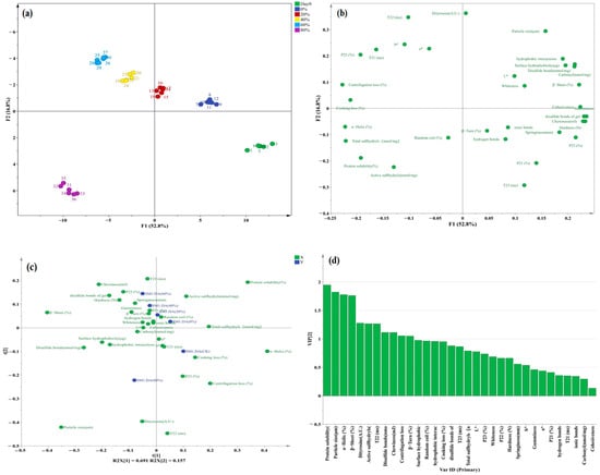 The linkage of protein oxidation and gel properties of minced pork in the Day 0 sample and MAP samples with different O2 concentrations were holistically investigated using principal component analysis (PCA) and discriminant analysis (OPLS-DA) (Figure 8). PCA analysis using an unsupervised technique was used to explore the similarities and hidden patterns between different groups [66]. It could be seen from Figure 8a that the data of various indicators in different processing groups had good repeatability and could be clearly distinguished. The data results of different treatment groups were clearly classified according to the first two principal components (PC1 was 52.8%, PC2 was 16.8%), covering 69.6% of the total data variance. The separable points on the PCA score plot indicate that there were significant differences in the degree of protein oxidation and gel properties of the samples after MAP at different O2 concentrations (Figure 8b). In order to better classify and interpret the protein oxidation degree and gel properties of different O2 concentration MAP treatments, as presented in Figure 8c, OPLS-DA analysis successfully isolated the significant differences between different O2 concentrations in MAP treatment groups. The variable importance in projection (VIP) score in Figure 8d assessed the most important indicators of protein oxidation degree and gel properties affecting different treatment groups, and identified a total of 11 indicators with significant contributions of variables (protein solubility, particle size, α-Helix, β-Sheet, dityrosine, active sulfhydryls, T22, disulfide bond, chewiness, centrifugation loss, and β-Turn). Therefore, it can be seen from Figure 8 that oxidation affected the properties of pork paste proteins and gels. There is a certain internal relationship between protein oxidation and gel properties.