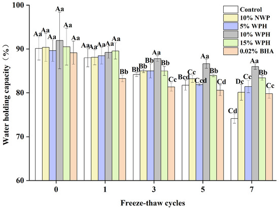 Effects of WPH on the water-holding capability of surimi balls during repeated F–T cycles. Uppercase letters (A–D) indicate significant differences between distinct cycles. Different lowercase letters (a–d) indicate significant differences between treatments. Control: without additives in the sample; NWP: natural whey protein; WPH: whey protein hydrolysates; BHA: butyl hydroxy anisole.