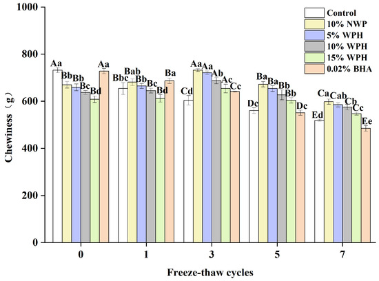 Effects of WPH on chewiness of surimi balls during repeated F–T cycles. Uppercase letters (A–E) indicate significant differences between distinct cycles. Different lowercase letters (a–e) indicate significant differences between treatments. Control: without additives in the sample; NWP: natural whey protein; WPH: whey protein hydrolysates; BHA: butyl hydroxy anisole.