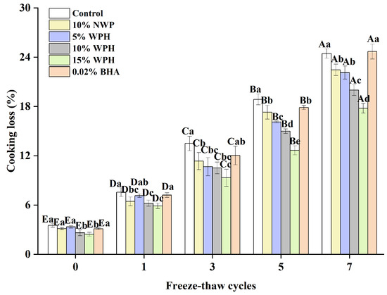 Effect of WPH on the cooking loss of surimi balls during repeated F–T cycles. Uppercase letters (A–E) indicate significant differences between distinct cycles. Different lowercase letters (a–e) indicate significant differences between treatments. Control: without additives in the sample; NWP: natural whey protein; WPH: whey protein hydrolysates; BHA: butyl hydroxy anisole.