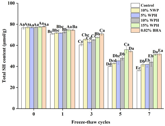 Effect of WPH on total sulfhydryl content of surimi balls during repeated F–T cycles. Uppercase letters (A–E) indicate significant differences between distinct cycles. Different lowercase letters (a–e) indicate significant differences between treatments. Control: without additives in the sample; NWP: natural whey protein; WPH: whey protein hydrolysates; BHA: butyl hydroxy anisole.