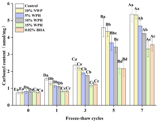 Effect of WPH on carbonyl content of surimi balls during repeated F–T cycles. Uppercase letters (A–E) indicate significant differences between distinct cycles. Different lowercase letters (a–d) indicate significant differences between treatments. Control: without additives in the sample; NWP: natural whey protein; WPH: whey protein hydrolysates; BHA: butyl hydroxy anisole.
