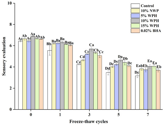 The ability of WPH samples to stabilize emulsions, hold water and fat, reduce lipid oxidation, and bind/fill the protein gel network may be related to the slight changes in the sensory preference observed during F–T cycles [35]. Sensory evaluation can reveal fundamental differences in properties between surimi ball samples [54,55]. Figure 8 illustrates how various additions affect the overall sensory qualities of fish balls. After seven freeze–thaw cycles, the surimi balls in each group’s total sensory evaluation decreased. The surimi balls were sensorially rated significantly lower (p < 0.05) for the blank control group compared to the groups who received 10% NWP, 5% WPH, 10% WPH, 15% WPH, and 0.02% BHA. The results of the 10% WPH and 15% WPH groups were higher and considerably better than those of the 0.02% BHA and blank control groups (p < 0.05) after three, five, and seven F–T cycles were completed. Similarly, Su et al. [56] found that the texture score of the fish sausage produced using modified whey protein was greater than that of the control group. It is clear from the above that healthier surimi balls with a reduced loss of sensory quality can be made using the WPH. Moreover, the 15% WPH samples showed increased sensory preference as the F–T duration increased.