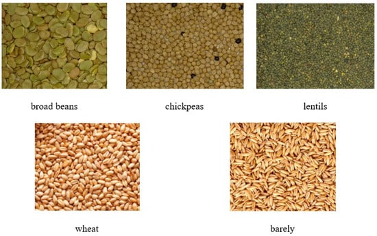 Three types of legumes and three types of cereals were considered for the survey. Legumes were broad beans, chickpeas, and lentils, while cereals were wheat and barley. The choice of these products was dictated by the type of crops grown in Italy and the crop rotations that are usually carried out were also considered (Figure 1).