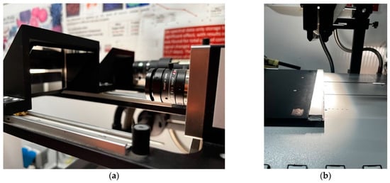 In order to investigate the optical properties of legumes and contaminants, an analysis protocol based on hyperspectral imaging was implemented. The instrumentation used was a hyperspectral plane scanner DV-Optic s.r.l., equipped with two types of sensors. The first is of the VIS/NIR type, with a Specim Impsector V10 spectrometer (Specim spectral imaging LTD, Oulu, Finland), with a wavelength range from 400 to 1000 nm, with a sampling step of 5 nm, while the second, of the SWIR (Short Wave Infra-Red) type, features an InGaAs sensor (Xeva InGaAs VIS/NIR 320 × 256 FPA, Xenics nv, Leuven, Belgium), capable of acquiring reflectance at wavelengths from 1000 to 1700 nm, with a sampling step of 5 nm. The illumination sources are different for the two types of sensors. For the VIS/NIR, a halogen illuminant (150 W) was used, to which a fibre optic guide terminating in a linear collimator was connected in order to illuminate the scanner’s line of sight. For the SWIR sensor, a halogen source with an emission spectrum between 800 and 2000 nm was used (EKE 9596ER, 150 W). This illuminant was also equipped with a fibre-optic guide and linear collimator (Figure 2). To enable the sensors to receive the reflected radiation from the object, two mirrors oriented at 45° were placed in the line of sight of the two sensors (Figure 2b).