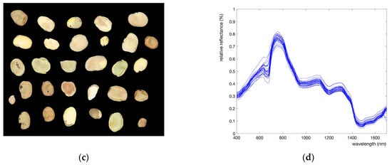where Rλ is the recorded hyperspectral image, Dλ is the dark component image (0% reflectance) acquired by turning off the lighting source with the lens of the camera completely closed by a black cap, and Wλ is the white reference component image (acquiring the white board reference). Equation (1) was iteratively applied for all 261 component images to obtain the corrected component images (Rcλ). These corrected images were repacked into a hyperspectral image. The hyperspectral images were then exported in an ENVI format. Using MATLAB r2023b software, the hyperspectral images were read and processed, removing the acquisition background and calculating the average reflectance value, at all wavelengths, of the image areas characterised by the product units. Figure 2c shows an example image, in pseudo colours, of the masked hyperspectral image of broad beans samples. The hyperspectral data were then stored in vectors in order to generate the relative reflectance spectra (Figure 2d). The reflectance spectra obtained were derived from the analysis of numerous hyperspectral images for each product type considered. Figure 2d shows the 30 reflectance spectra for the 30 product units in the hyperspectral image in Figure 2c.