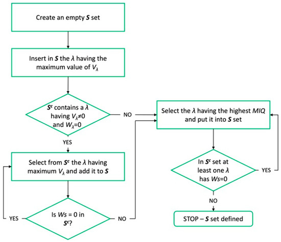 FS-MRMR algorithm flux diagram. Λ = wavelength range 400–1000, 5 nm step; = relevance of the selected wavelength; = redundance of selected wavelength; Sc = (Ω − S), indicating the complement set of S.